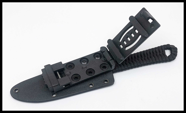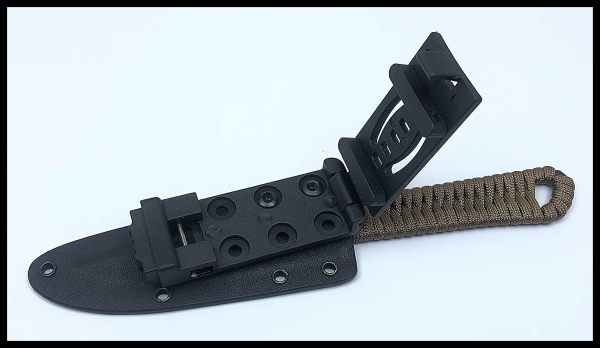 The ambidextrous sheath (left or right carry) is made from 1.5mm Kydex, hot shaped to fit the knife like a glove, with the knife "clicking" into place. Yes, you can ride your horse and it will not fall out, until you decide to cut ...everything...