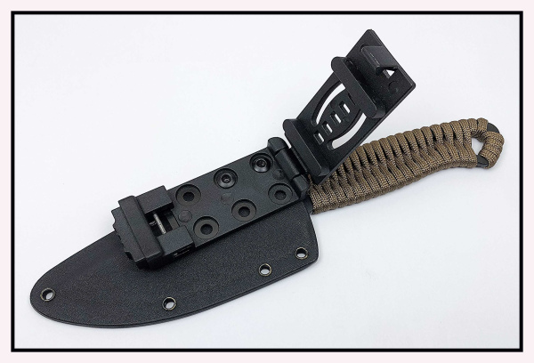 The ambidextrous sheath (left or right carry) is made from 1.5mm Kydex, hot shaped to fit the knife like a glove, with the knife "clicking" into place. Yes, you can ride your horse and it will not fall out, until you decide to cut ...everything...